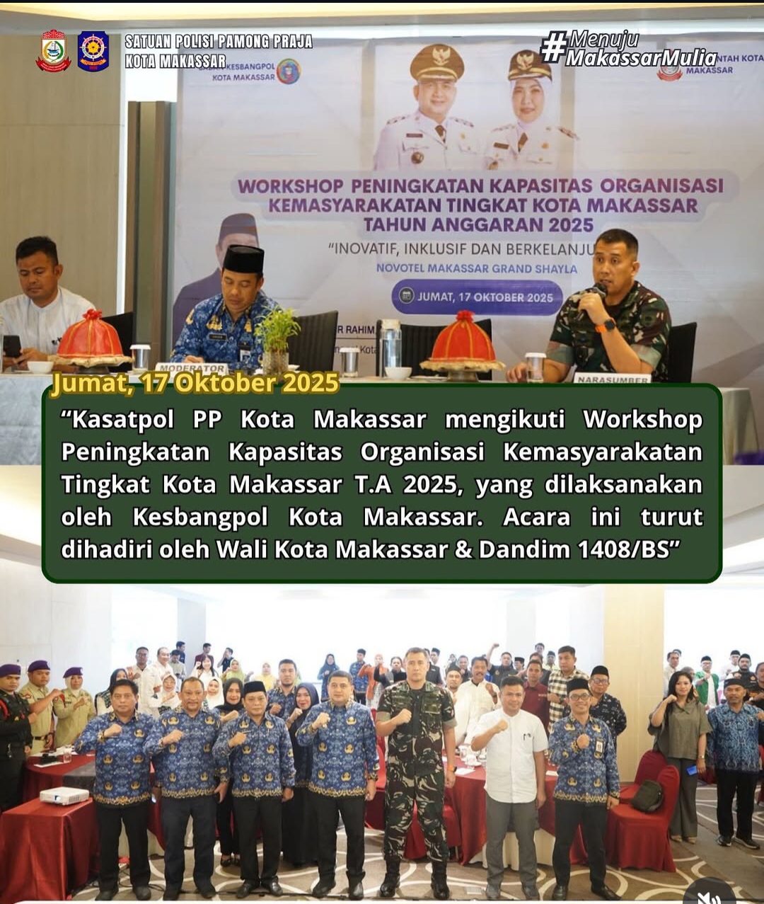 MAKASSAR.portalcelebes.com- Kasatpol PP Kota Makassar mengikuti kegiatan Peningkatan Kapasitas Organisasi Kemasyarakatan yang diselenggarakan oleh Kesabangpol Kota Makassar. Jum‘at, 17/10/2025 Pemerintah Kota Makassar terus berupaya meningkatkan kapasitas organisasi kemasyarakatan melalui berbagai program pembinaan dan pemberdayaan. Langkah ini bertujuan agar ormas mampu menjalankan fungsi sosialnya secara efektif, transparan, dan sesuai dengan peraturan perundang-undangan.