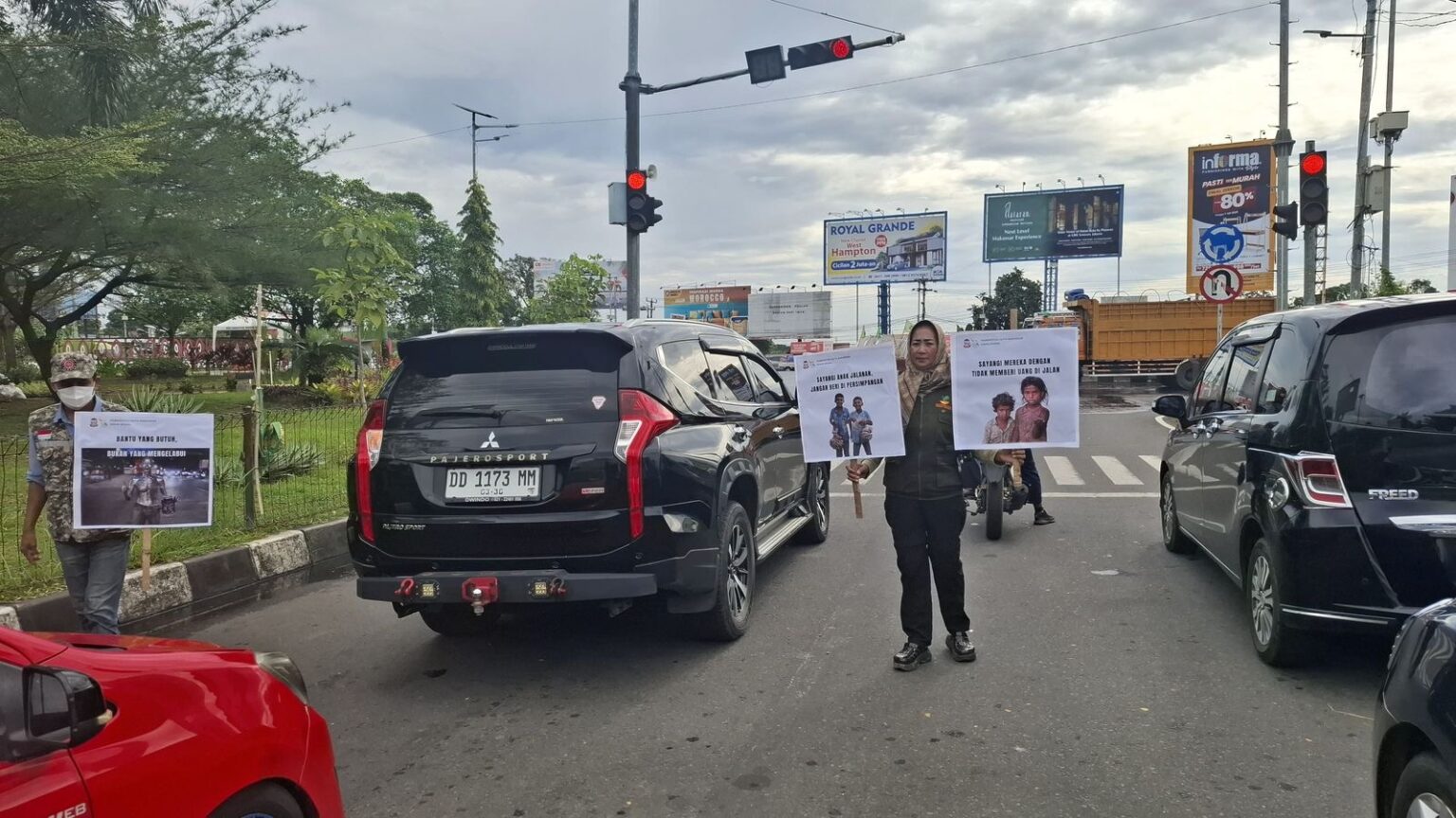 Dalam giat Posko Anjal ini, Kadis Sosial Andi Bukti melakukan inovasi dengan memberikan alat peraga berupa narasi edukasi tentang larangan memberi pengemis di jalan.